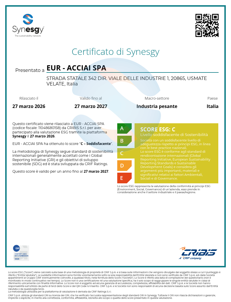 La certificazione ESG è un attestato rilasciato da enti terzi indipendenti che convalida l’impegno di Eur-Acciai S.p.A. nei criteri Environmental (ambientali), Social (sociali) e Governance (gestione aziendale).